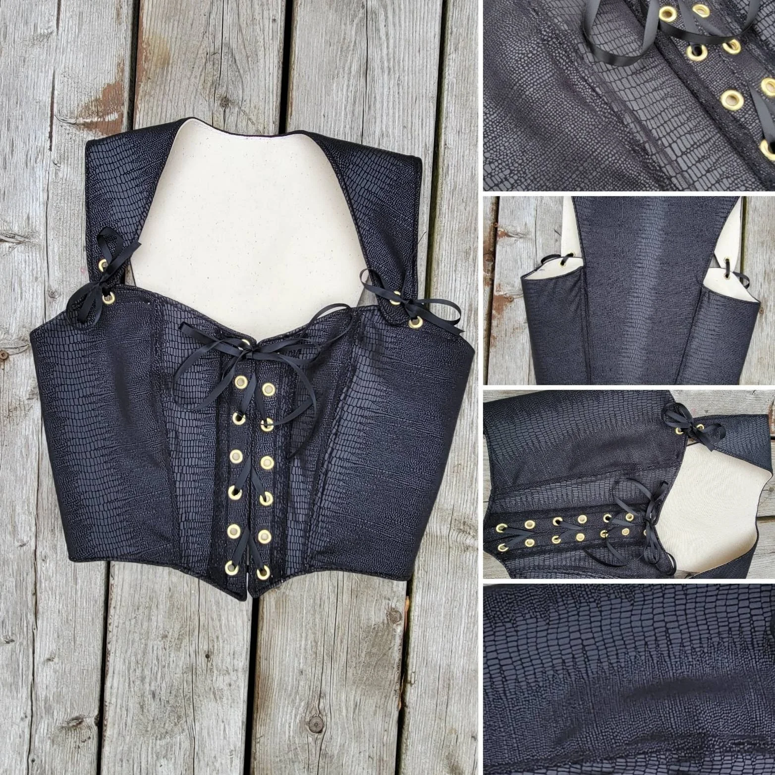 Bustier style corset avec bretelles larges qui s'ajustent devant. Lacé devant avec une légère pointe au millieu. Aucune baleine ou cerceau. Doublé en canvas de cotton 10oz. Très respirant et souple. L'ouverture devant peut varier selon la forme du corps.